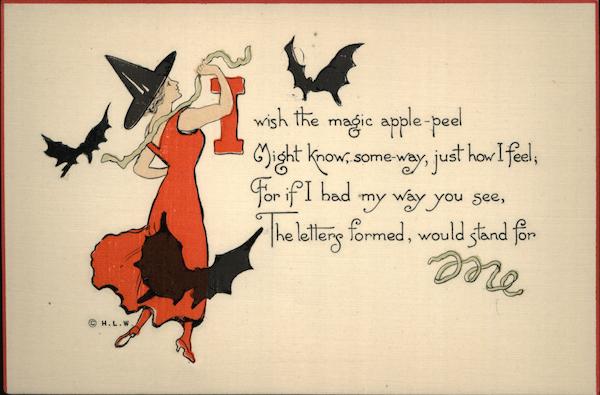 Front: wish the magic apple -peel Cisht know, some-way, just how I fel, For if I bad he letterng formed, would stand för my way you see, © H.L.W. Back: HANDEMBOSSED M L WOEHLER, NEW YORK (Made in Germany. )