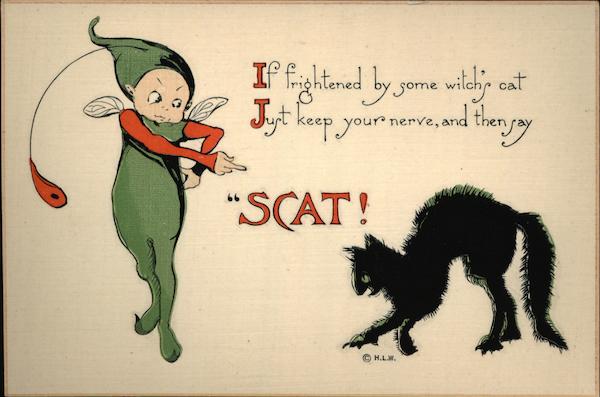 Front: If frightened by gome wilchy keep your nerve, and yay cat ther nerve,and "SCAT! © H.L.W. Back: HANDEMBOSSED H. LWOEHLER, NEW YORK (Made in Germany. ).