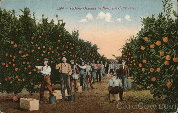 Front: 3284 Picking Oranges in Northern California. - Back: PUB BY SOUVENIR PUBLISHING CO. SAN FRANCISCO 75- >1¢ FOREIGN 2¢ THIS SPACE FOR ADDRESS ONLY