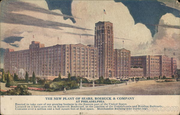Erected to take care of our growing business in the Eastern part of the United States. Located on a forty-acre site on Roosevelt Boulevard, at the junction of the Pennsylvania and Reading Railroads. Contains over a million and a half square feet of floor space. Merchandise Building nine stories high. |