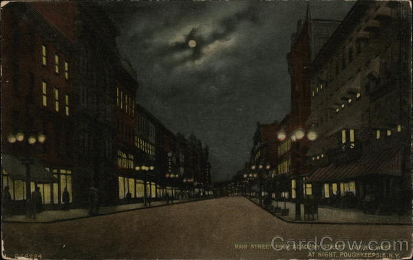 Front: 111 111 law B4224 MAIN STREET FROM ACADEMY STREET LOOKING WEST AT NIGHT, POUGHKEEPSIE, N.Y. Back: The Valentine-Souvenir Co., New York. Printed in U. S. A. DUTCHESS THROUGHOUT SUPERIOR QUALITY FAMOUS THE WORLD 20 Address Only