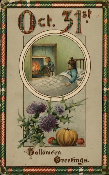Front: Oct. 31" allowe'en Greetings. Back: 457 40 * 158 Perde POST CARD. U.SE J O O THE ADDRESS TO BE W WA ON THIS SIDE CEN To na BERS OCT29 6 304 Happy to Helo Rid busy neas you are The come Birthday ber Ra Series No. 2402