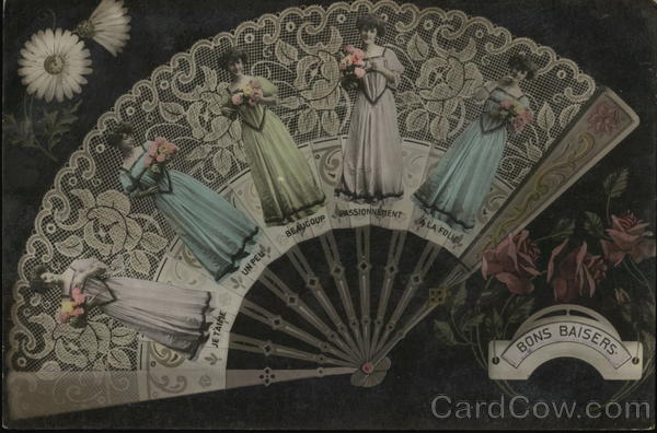 Front: PASSIONNEMENT BEAUCOUP À LA FOLIE UN PEU BAISERS BONS JE TAIME Back: Postkarte CARTE POSTALE Correspondenzkarte Cartolina postale Dopisnice Levelezô-Lap Briefkaart Union Postale Universelle Weltpostverein Union Postale Universale