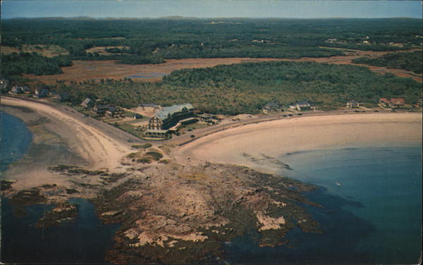 Published by Eastern Illustrating and Publishing Co., Inc., Belfast, Maine The Beaches and Narragansett Hotel Kennebunk, Maine Airview in Color by Ray Goodrich P7747 Plastichrome. by COLOURPICTURE PUBLISHERS, INC., Boston 15, Mass., U.S.A. HERE