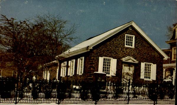 | GERMANTOWN MENNONITE MEETINGHOUSE, 6121 GERMANTOWN AVENUE, PHILADELPHIA PA. ERECTED 1770. THE FIRST MENNONITE CONGREGATION WAS BEGUN IN GERMANTOWN IN 1683. THIS VIEW OF THE MEETINGHOUSE WAS TAKEN IN 1974. SUNDAY SCHOOL 10:00 A. M. SUNDAY MORNING WORSHIP 11:00A. M. |