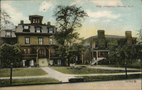 Front: KL 71 City Hospital, Ithaca, N.Y. 13763 O Back: sear Yeorge; many thanks for card. Late Cur school begin 200 g suenday. I Mr. George. fa didn't want to go back did you I like it well enough now though Mary Hill. STAMP HERE