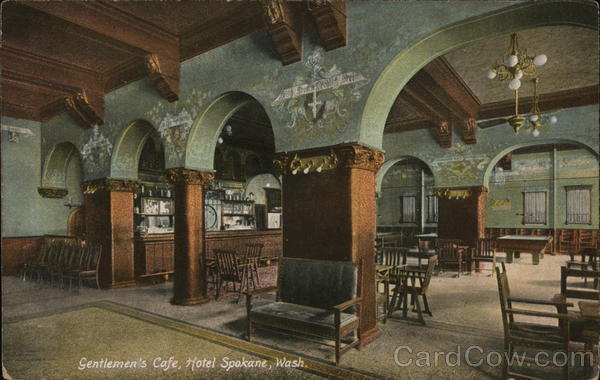 Front: Fisch Fronta Groblich Sret Gentlemen's Cafe, Hotel Spokane, Wash. Back: by M. Rieder, Los Angeles. No. 4120. MADE IN GERMANY. Published by for F. D. Shaw, Spokane, Wash. TWO CENTS