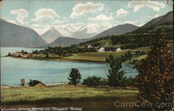 Front: MEN Sondmor. Between Westnäs and Ellingaard. Norway. 31 Ran Back: Publ. by Fredrik Peterson, 36 Bromfield St. Boston, Mass. Made in Germany. POST-CARD