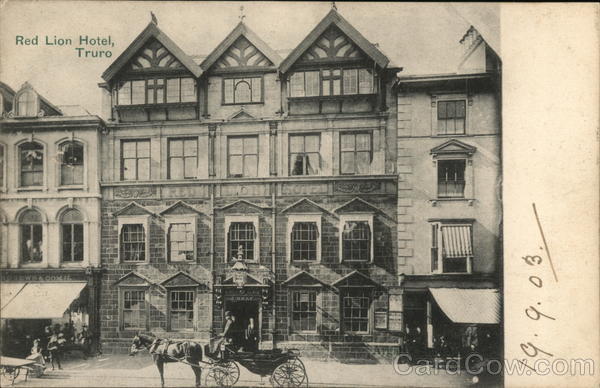 Front: Red Lion Hotel, Truro NDREWS & COMEL ex RED LION HOTEL J. BRAY gall 19.9.03. Back: Write here for Inland Postage only. Market Day Capt: J. Care Cathedral. Male HALF PENNY TH & REVENUE SF20 Horace Villag Granparund Poad.