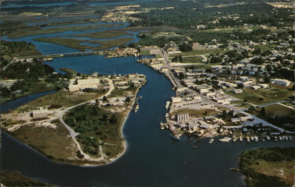 | Aerial view looking eastward over Anclote River. This is the center of America's sponge diving industry. Dodecanese Boulevard, running eastward along the river, is the location of fine Greek restaurants and curio shops and the docking area for many fascinating sponge boats and fishing cruisers. |
