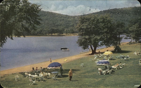 VIEW OF WATERFRONT AT Edgewater Motel CHROON and RESTAURANT on Schroon Lake. NY. AUC24 2 PM JOHN ADAMS 9997 - 1864 1954 2 CENTS 2 The Berkes here taught e're staying Tam today we all / et the Game #BoBernard Keybecke 281 Main Gas Narwalk Coun, Tue,