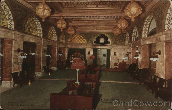 Front: (44 Copyright 1907 by Geo, R. Lawrence Co. Ph MAIN LOBBY CONGRESS HOTEL AND ANNEX, CHICAGO Back: No. 1498. V. O. Hammon Pub. Co., Chicago SVOR HAMMON [PUBLISHING CO TRADE CHICAGO MARK FOREIGN