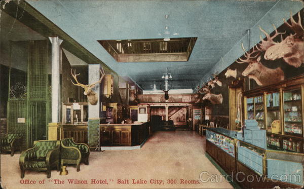 Front: ****** "" Office of The Wilson Hotel," Salt Lake City, 300 Rooms. Back: San Francisco. Pub. by Souvenir Publishing Co. Los Angeles. IND ORN NO COLORPRINT CO LOS ADELE THIDE FOR COP IESPONDENCE Cuba 1c: 2c: