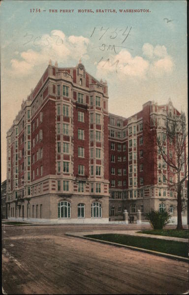 Front: 1754 - THE PERRY HOTEL, SEATTLE, WASHINGTON. 2052 ill 1734 3AA Sine IN HE TEL 100 Back: MADE IN AMERICA BY EDW. H. MITCHELL AT SAN FRANCISCO, THIS SPACE FOR ADDRESS ONLY