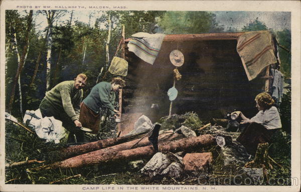 Front: PHOTO BY WM. HALLWOP TH, MALDEN, MASS. CAMP LIFE IN THE WHITE MOUNTAINS. N. H. Back: 513 Pub. by Colesworthy Book Store, Boston, Mass. NEN BOSTON CASCADE STUDIO, NO. WOODSTOCK, N. H. 50