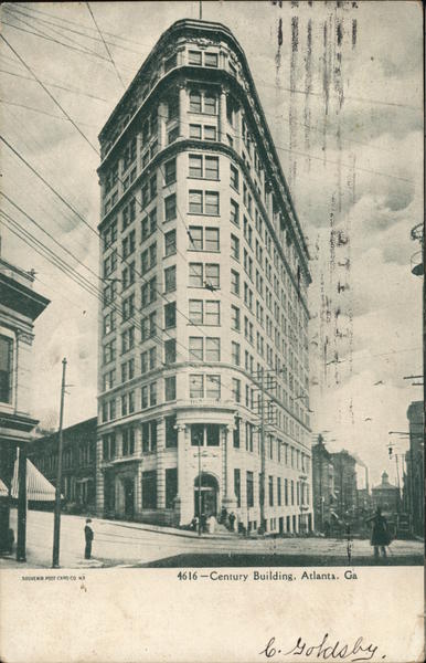 Front: SOUVENIR POST CARD CO N.Y. TILIL 36 AC 30 **** 4616-Century Building, Atlanta, Ga 6. Goldsby 38 Back: AUGA GUST MAY 23 BAYER P67 bz BA PM if HS 190 A.M VT 1706 FRANKLIN 1790 Miss Jani Harrington Shaftsbung, VZ.