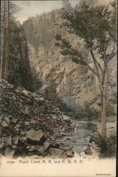 Front: 51684 Rapid Creek M. R. and N. W. R. R. Handcolored. Back: The Rotograph Co., N. Y., City. (Germany.) RIN APID SEP JIAM 5.DP Mrs. L. M. Bitney isang BILLED Sturgie S.O. STATES OF 1:06 FRANKLIN 1790 80G ONE CENT