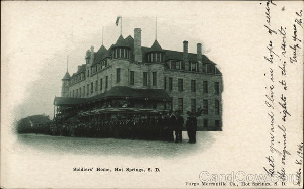 Front: Fargo Mercantile Co., Hot Springs, S. Soldiers' Home, Hot Springs, S. D. Let you and I live in hopes of relig эрот стр со дрво раивать про Drec. 8. 1904. Truly yours 16. E. Back: Mers. L. M. Bitury Sturgis City I. J.