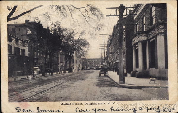 Front: Market Street, Poughkeepsie, N, Y. Dear Emma. J.KOEHLER.NY. Are you having a good time Back: vid 21 god Poat | อง 1905 0:270 BANCAL OCT 1905 6 k POST CAPO QO Q Miss Emma Knaff millbrook n.y. SERIES 1902 UNITED STATES OF 706FRANKLIN 1790 2,50