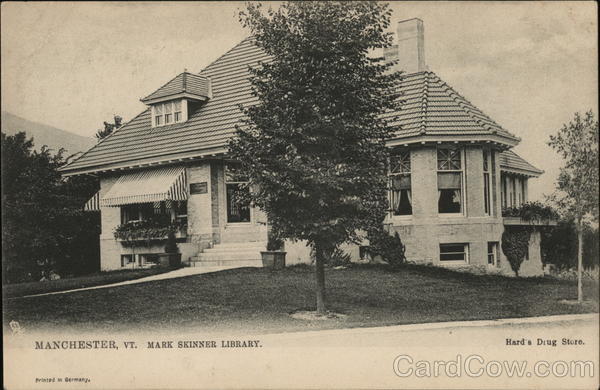 Front: MANCHESTER, VT. MARK SKINNER LIBRARY. Hard's Drug Store. Back: BEN Raphael Tuck & Sons' Post Card Series No. 2102. "MANCHESTER, Vt" ART PUBLISHERS TO THEIR MAJESTIES THE KING AND QUEEN. THANK MARK ARTISTIC