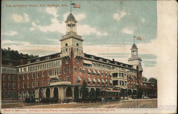 Front: The Arlington Hotel, Hot Springs, Ark. 1.11. DBBL LLLE I CHEC Beeffffff 1 0111 JAAM 200 Made in Germany. Arlington News Stand, Importers and Publishers, Hot Springs Ark. Back: 963 EXCLUSIVE 75