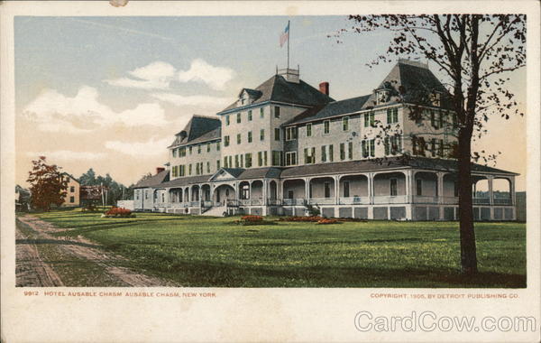 Front: 146 9912. HOTEL AUSABLE CHASM AUSABLE CHASM, NEW YORK. NG 11 COPYRIGHT, 1905, BY DETROIT PUBLISHING CO. Back: and Canada, Foreign, Two Cents.