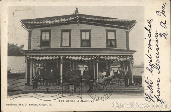 Front: Published for R. M. Cowles, Albany, Vt. NTPEL POST OFFICE, ALBANY, VT. NO With best wishes, from Cousin. A.M. Back: ASBUR HIND SERIES 1902 UNITED STATES OF 1706 FRANKLIN 1790 Meis M.A. Me Governa, Pavilion Montpelier, 46. .....