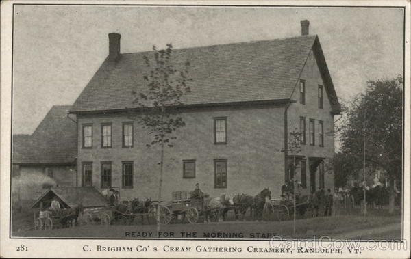 Front: 281 Me 301 READY FOR THE MORNING START C. BRIGHAM Co's CREAM GATHERING CREAMERY, RANDOLPH, VT. Back: 8-783 Buck Printing Co., Randolph, Vt. 11 (ONE CENT) HERE