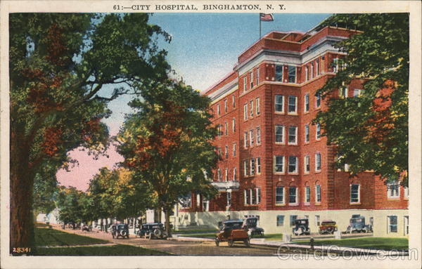 Front: 28341 61: CITY HOSPITAL, BINGHAMTON, N. Y. Host Si OLD 771 0.20 4:11 LEE UI [] UTE 9910 JUL 11 Back: Pub. by Pierson Bros., Binghamton, N. Y. HACEMUSA IN QUALITY VIEWS Place the Stamphere land Island Possessions Cuba, Canada and for foreign