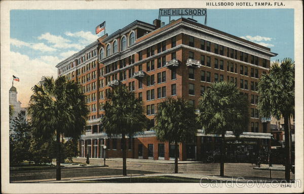 Front: THE HILLSBORO LL HILLSBORO HOTEL, TAMPA, FLA. 30 101 LESBORO 71292 Back: HILLSBORO NEWS CO., TAMPA, FLA. C. T. AMERICAN ART COLORED AGO va HERE