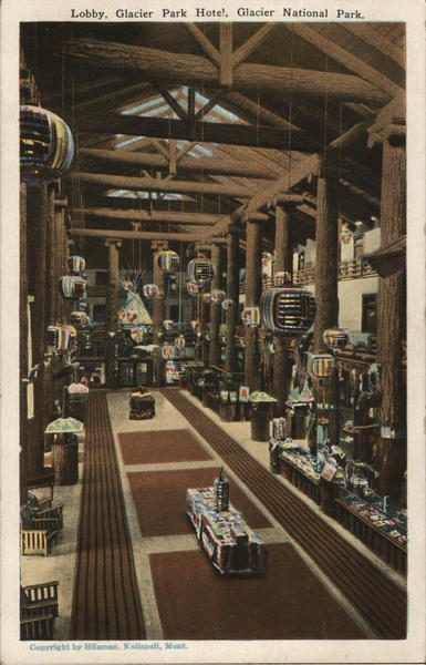 Front: Lobby, Glacier Park Hotel, Glacier National Park. J1 Copyright by Hileman, Kalispell, Mont. AUDINTY Back: Published by Glacier Park Hotel Co., Glacier National Park, Mont. 30959 Co