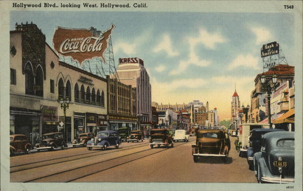 Front: Hollywood Blvd., looking West, Hollywood, Calif. Mammmyy Coca-Cola STRASS NON ***** 1908 KRESS * 19%*** de Bank America T548 68332 Back: tichnor art company, L. A. MADE IN U. S. A