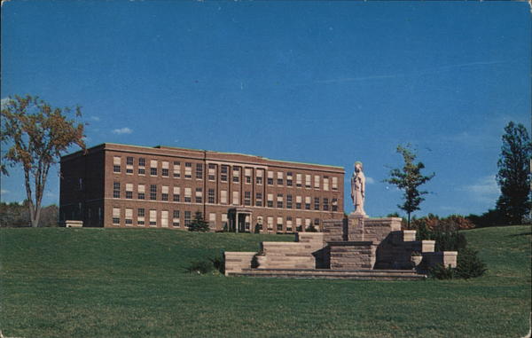 Sullivan Hall Liberal Arts Building With The Shrine of Our Mother of Good Counsel Merrimack College No. Andover, Massachusetts Published by Don Sieburg, New London, N. H. by COLOURPICTURE PUBLISHERS, INC., Boston 15, Mass., U.S.A. P28505 HERE