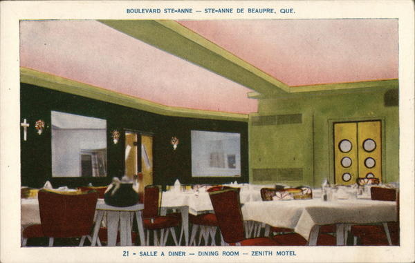 Front: BOULEVARD STE-ANNE 21 - SALLE A DINER iVMKNY 10 STE-ANNE DE BEAUPRE, QUE. DINING ROOM Vin ZENITH MOTEL Back: LORENZO AUDET ENR., 1226 AVE. DES PINS, QUÉ., P. CARTE- POSTALE