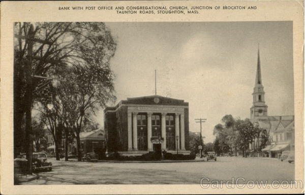 Front: BANK WITH POST OFFICE AND CONGREGATIONAL CHURCH, JUNCTION OF BROCKTON AND TAUNTON ROADS, STOUGHTON, MASS. NORFOLK COUNTY TRUST COMPANY Back: PUB. BY CAMPBELL'S DRUG STORE, STOUGHTON, MASS.