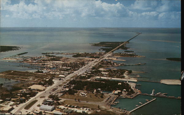 Airview of Marathon, Florida, looking south along the Overseas Highway which leads to Key West. Koppel Color Cards, HAWTHORNE, N. J. Florida Natural Color, Inc., 315-317 W. 47th Street, Miami Beach 40, Florida FNC-3707 20087 Address
