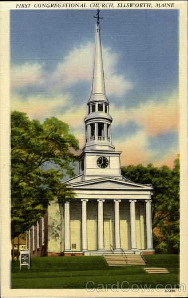 Front: FIRST CONGREGATIONAL CHURCH, ELLSWORTH, MAINE 87338 Back: "TICHNOR QUALITY VIEWS" REG. U. S. PAT. OFF. MADE ONLY BY TICHNOR BROS., INC., BOSTON, MASS.