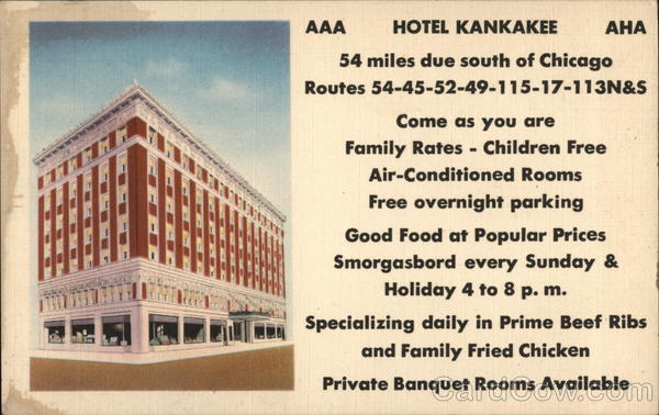 54 miles due south of Chicago. Come as you are. Family rates - children free. Air conditioned rooms. Free overnight parking. Good food at popular prices. Smorgasbord every Sunday & Holiday 4 to 8 pm. Specializing daily in prime beef ribs and family fried chicken. Private banquet rooms available. |