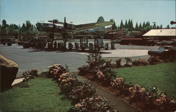 | The unique Bomber service station, sheltering its 30 pumps, is among Oregon's most famous landmarks. In 1947, it was placed in memoriam to the service personnel and the vital role the B-17 played during World War II. The Bomber complex also provides a deluxe western motel, fine dining facilities and a heating oil business. Native Oregon rhododendrons and azaleas flourish in the foreground. |