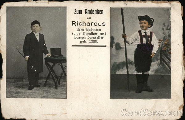 Front: Zum Andenken an Richardus dem kleinsten Salon-Komiker und Damen-Darsteller geb. 1889. Back: Paul Schaerf, Gera-R. Carte Postale.