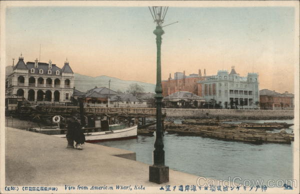 Front: LXD oooo KAG (50) (行政店商屋薬戸神) Vieu from American Wharf, Kube 通岸海波ンケリメア神 Back: POSTKARTE CARTOLINA POSTALE ОТКРЫТОЕ ПИСЬМО. MADE IN JAPAN. キャガハ便郵