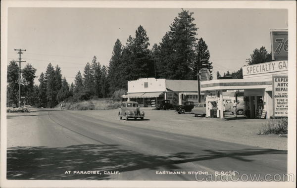 Front: AT PARADISE, CALIF. THE BEST CHOCOLATE CE Home Made PIES EASTMAN'S STUDIO UNION OIL DEALER B-8424 SHORT 76 SPECIALTY GA EXPER AUTO REPAI - ALL WORK GUARANTE TUNE-U BRAKE! PARTS AN ACCESSORIE WHITE G Back: 10- DEVOLITE PEERLESS
