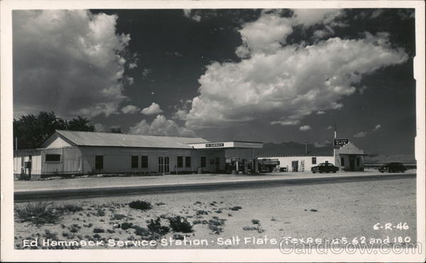 Front: ED HAMMACK SALT FLATS CAFE 6-R-46 Ed Hammack Service station Salt Flats, Texas u.s.62 and 180 Back: 850 POST CARD