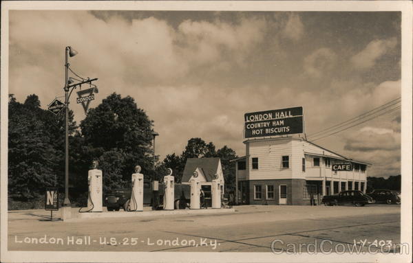 Front: GOOD YEAR TIRES Nh CONOCO London Hall-U.S.25-London, Ky. LONDON HALL COUNTRY HAM HOT BISCUITS COUNTRY HAM CAFE 1-Y-403 Back: 50 A Photograph Card by W M Cline Co Chattanooga Tend
