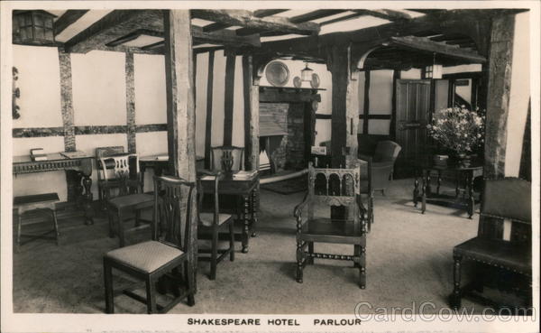 Front: 1011114 DA AV AR SHAKESPEARE HOTEL PARLOUR PARLOUR Back: BY ERNEST DANIELS, 10 Bridge Street & 1 Waterside Stratford upon Avon. Telephone 481 Shakespeare Hotel Stratford-upon-Avon. Tel. 328