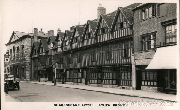 Front: CEB HP 4328 Shakespeare ANA SHAKESPEARE HOSTERTE SHAKESPEARE HOTEL SOUTH FRONT Back: BY ERNEST DANIELS, 10 Bridge Street & 1 Waterside Stratford upon Avon. Telephone 481 Shakespeare Hotel Stratford-upon-Avon. Tel. 328