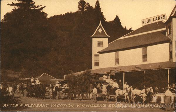 Front: BLUE LAKES AFTER A PLEASANT VACATION, W.H.MILLER'S STAGE LINE OF UKIAH, CAL. Back: Message From Carrill JANSSEN JLC PRESS Domestic 14 Foreign 24