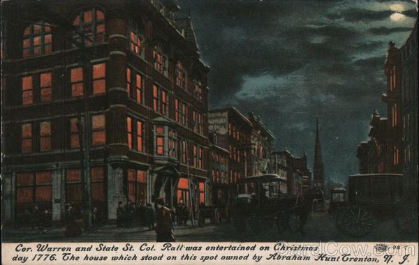 Front: UN SUPPLIES 11 98 7 Cor. Warren and State St. Col. Rall was entertained on Christmas day 1776. The house which stood on this spot owned by Abraham Hunt Crenton, N. J. Back: Canada Cuba Mexico, Hawaii Philippines Porto Rico 2 Cents