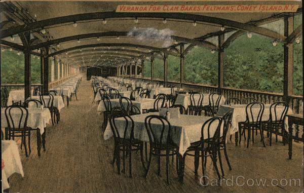 Front: VERANDA FOR CLAM BAKES FELTMANS, CONEY ISLAND, N.Y. S Back: 52 THIS SPACE MAY BE USED FOR COMMUNICATION. BE WRITTEN HERE. One Cent Stamp for United State's Canada & Mexico Two Gent Stamp for all other countries