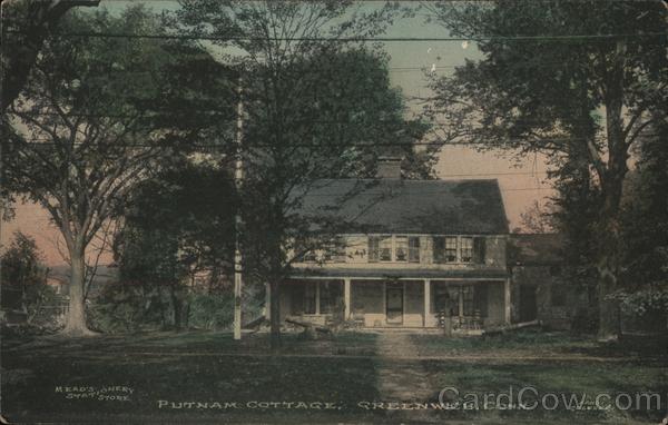 Front: MEAD'S, ONERY STAT STORE, PUTNAM COTTAGE, GREENWICH, CONN.. HAND COLORED Back: DOMESTIC, 1c FOREIGN, 2c. THE ALBERTYPE CO. BROOKLYN, N. Y.
